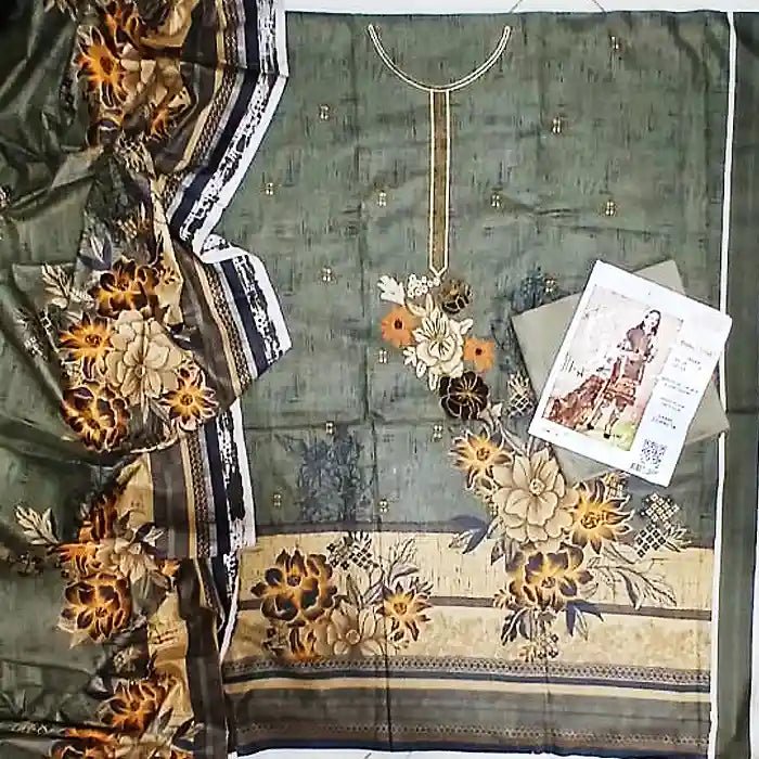 Dhanak Stuff (Winter)Fabric DhanakStyling Printed & Sequence EmbroideredProduct Category 3 Piece UnstitchedFront: Fully Printed & Sequence Embroidered | Back Digital PrintedWidth: 28" And Height: 40" (Fit in Every size) Sleeves: | EmbroideryDupatta: | PrintedTrouser: | Dyed Plan Trouser