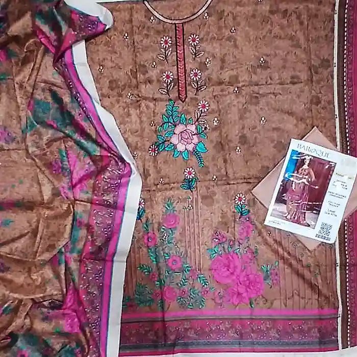 Dhanak Stuff (Winter)Fabric DhanakStyling Printed & Sequence EmbroideredProduct Category 3 Piece UnstitchedFront: Fully Printed & Sequence Embroidered | Back Digital PrintedWidth: 28" And Height: 40" (Fit in Every size) Sleeves: | EmbroideryDupatta: | PrintedTrouser: | Dyed Plan Trouser