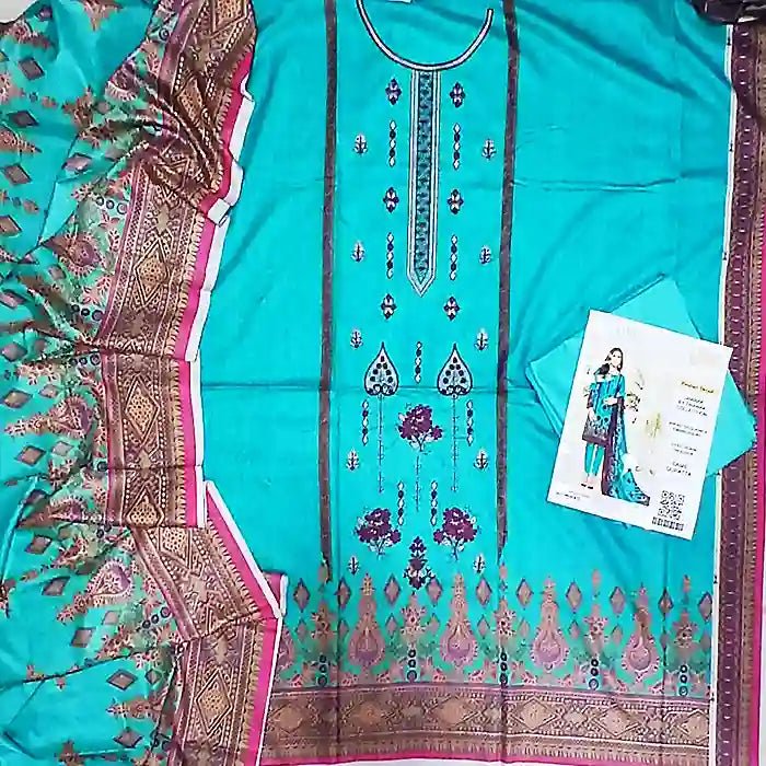 Dhanak Stuff (Winter)Fabric DhanakStyling Printed & Sequence EmbroideredProduct Category 3 Piece UnstitchedFront: Fully Printed & Sequence Embroidered | Back Digital PrintedWidth: 28" And Height: 40" (Fit in Every size) Sleeves: | EmbroideryDupatta: | PrintedTrouser: | Dyed Plan Trouser