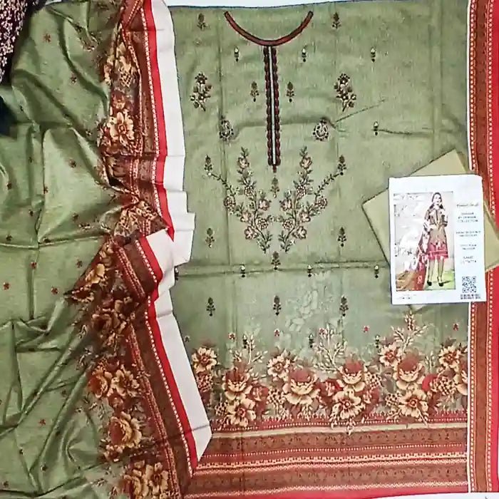 Dhanak Stuff (Winter)Fabric DhanakStyling Printed & Sequence EmbroideredProduct Category 3 Piece UnstitchedFront: Fully Printed & Sequence Embroidered | Back Digital PrintedWidth: 28" And Height: 40" (Fit in Every size) Sleeves: | EmbroideryDupatta: | PrintedTrouser: | Dyed Plan Trouser