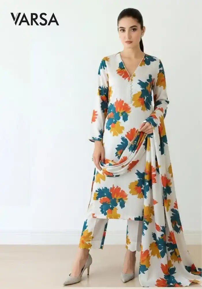 Floral Printed Silk 3 Pc Unstitched - white - Varsa.pk