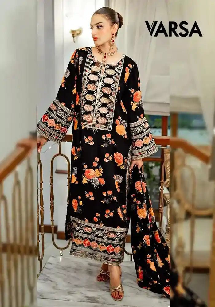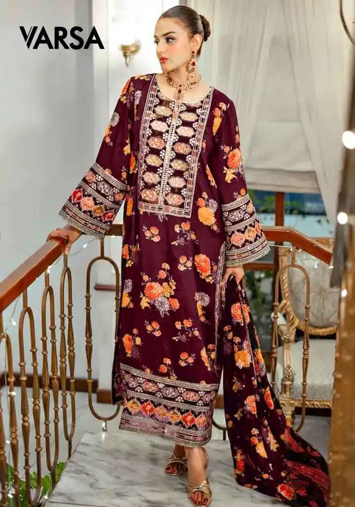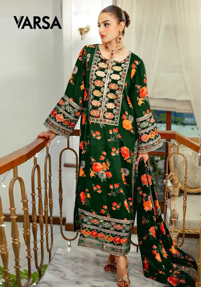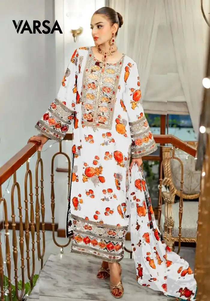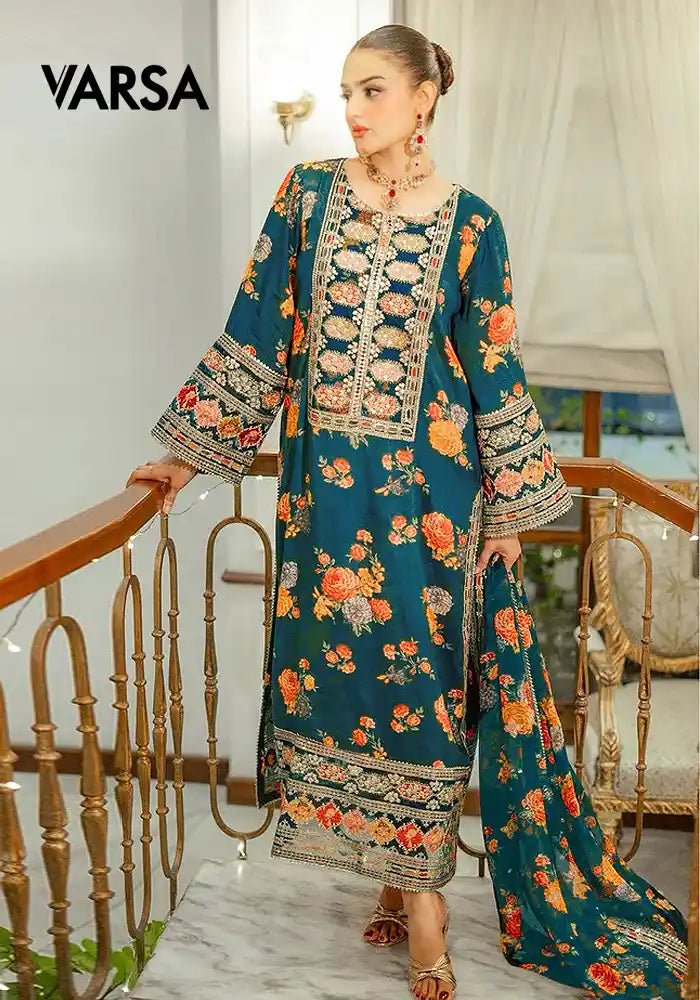 Premium 3-Piece Silk UnstitchedShirt – Silk Printed With EmbroideredDupatta – Medium Silk Printed 4 Side Embroidered BorderTrouser – Silk Printed