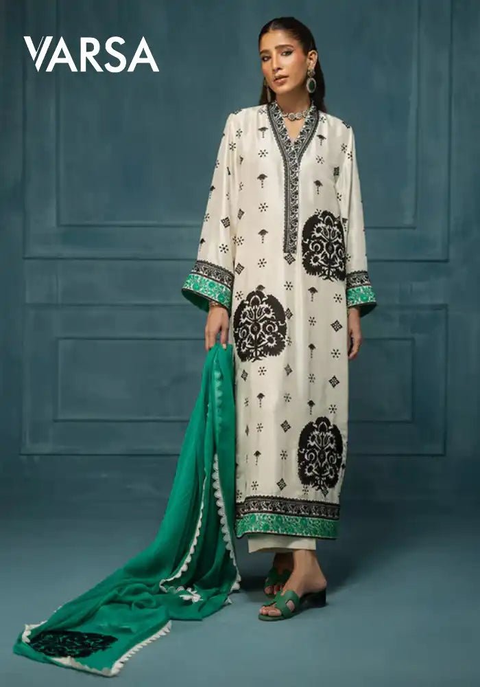 Printed Silk 3 Pc Unstitched - Green n White - Varsa.pk